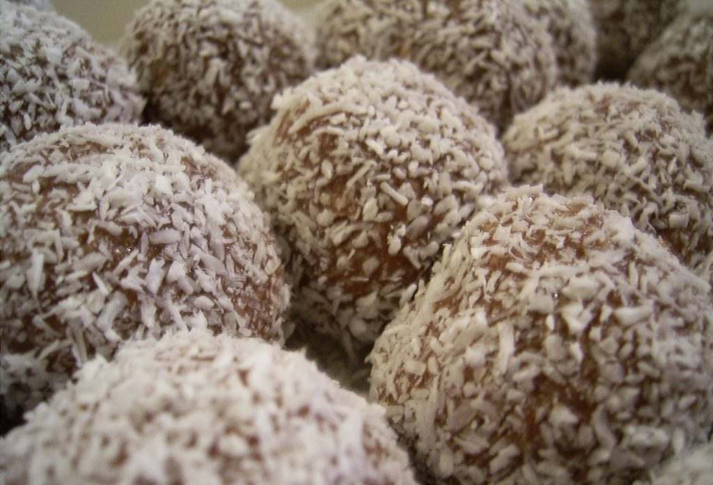 Shape small balls and cover them with grated coconut.